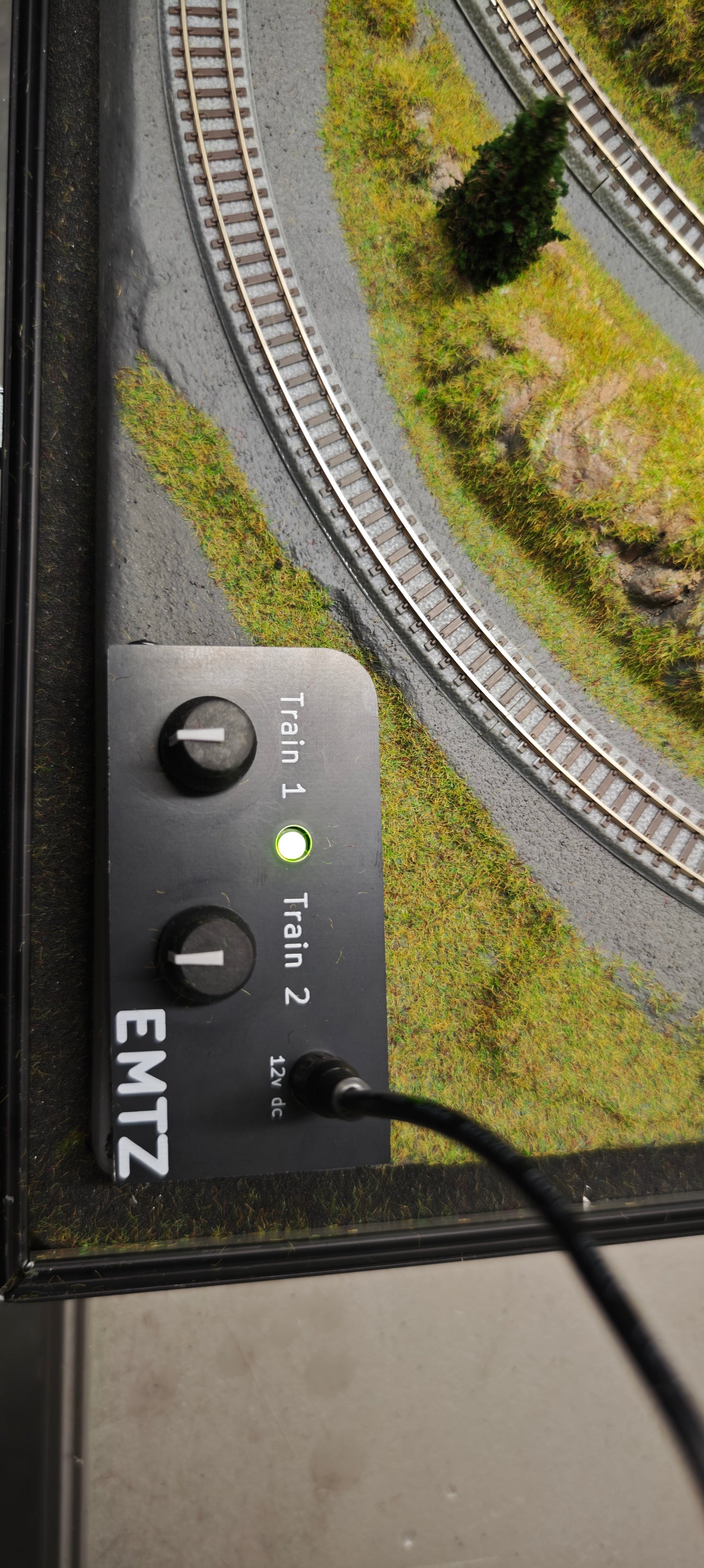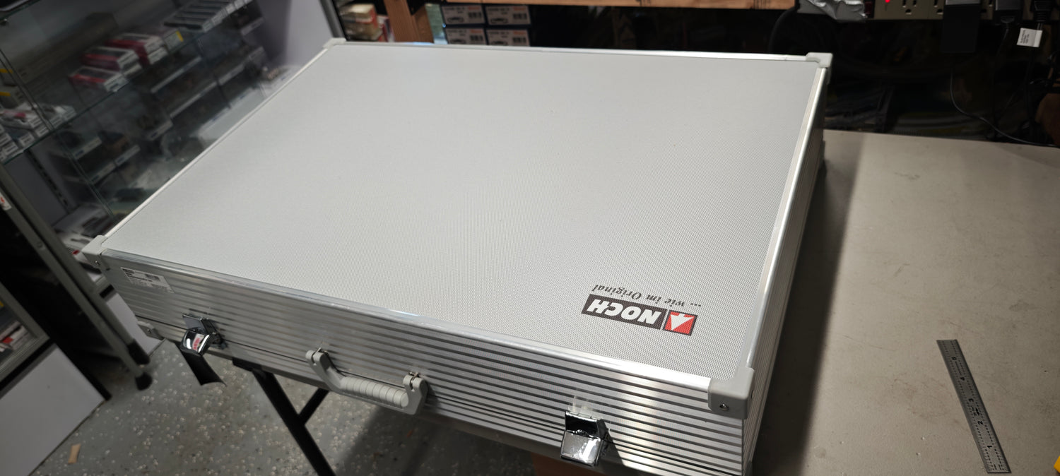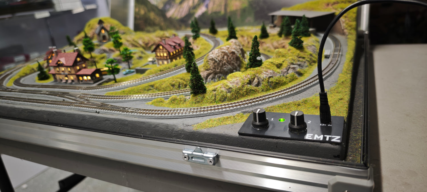 This briefcase layout has exactly the same NOCH Meran board for two trains operation and the same NOCH aluminum briefcase shell.