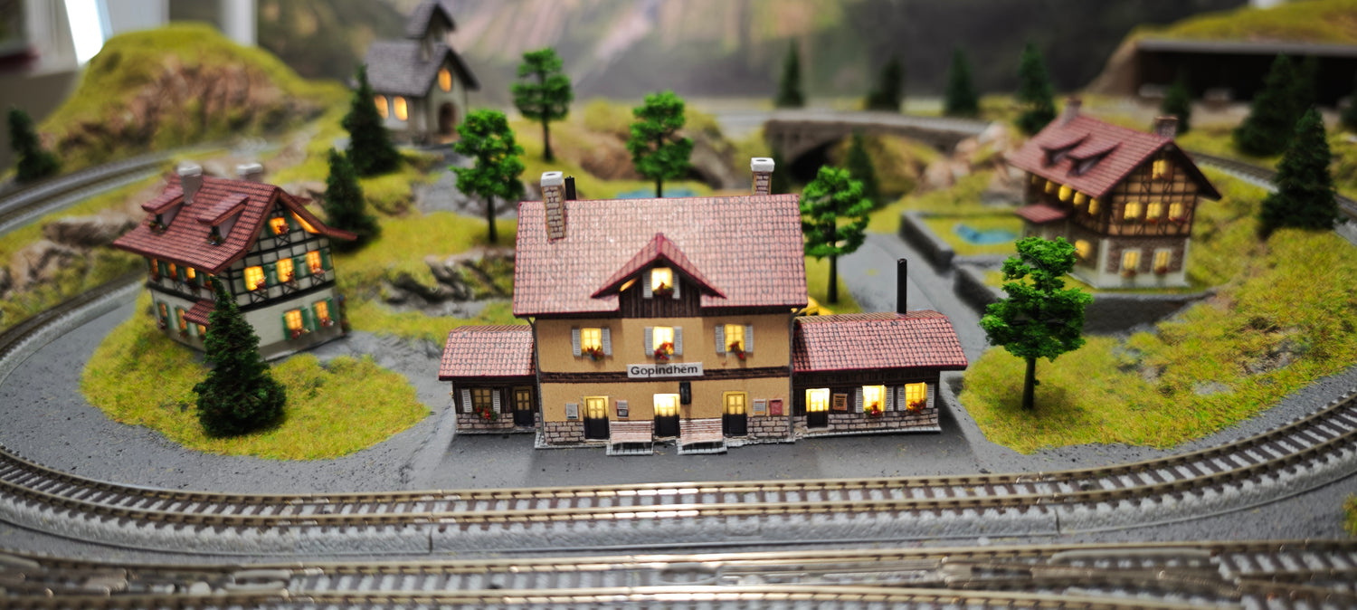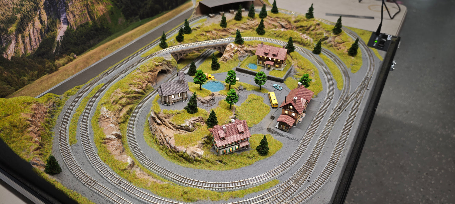 This beautiful Z-gauge summer layout offers lots of driving pleasure in a small space. The varied railway route leads over an imposing viaduct and through avalanche barriers. At the center of the layout lies a pretty little village with four illuminated houses. Thanks to the two railway circuits, trains can be controlled independently of each other. The layout can be operated with the enclosed plug-in 12v US AC adapter.