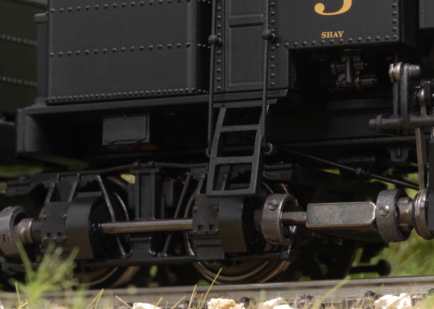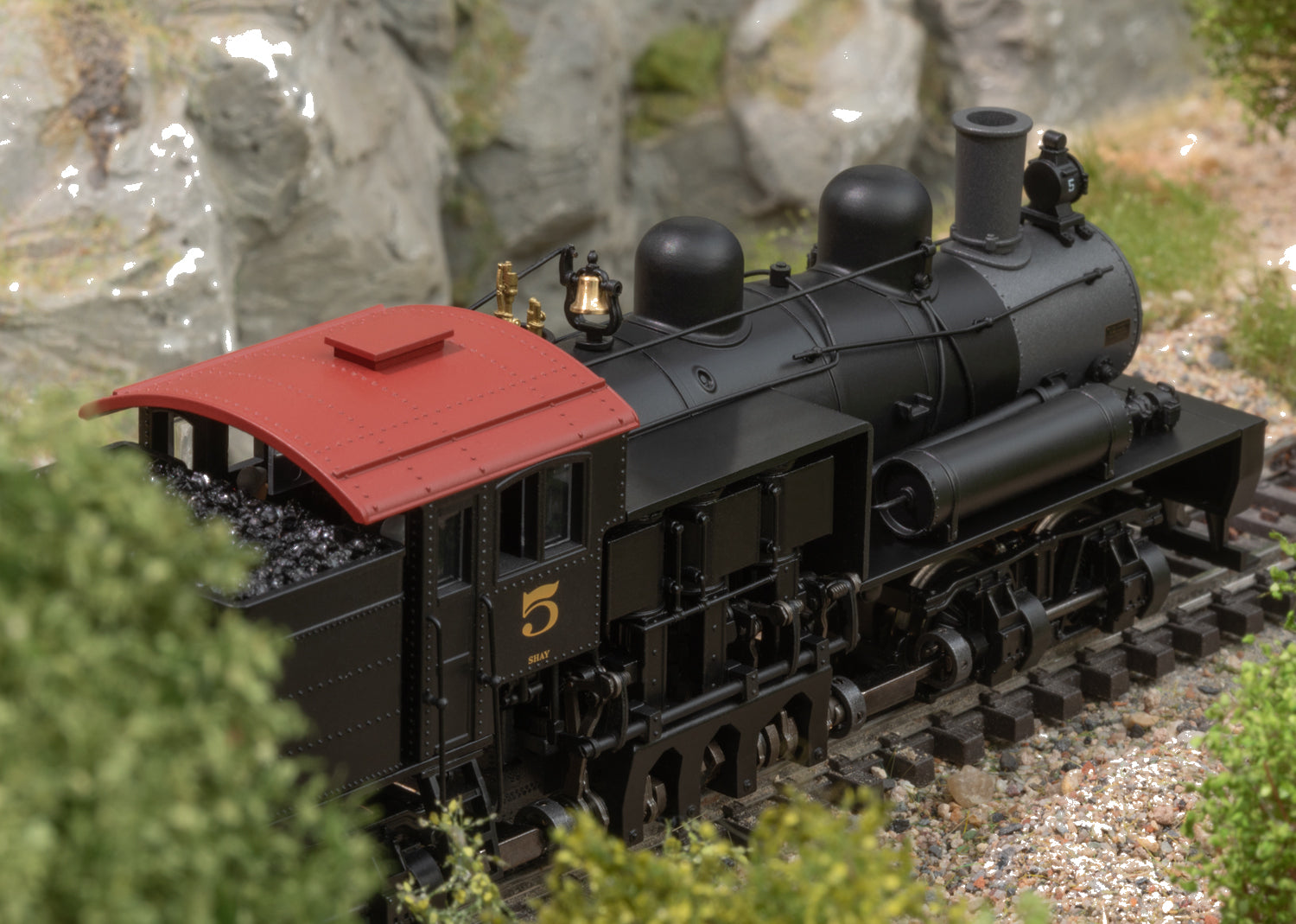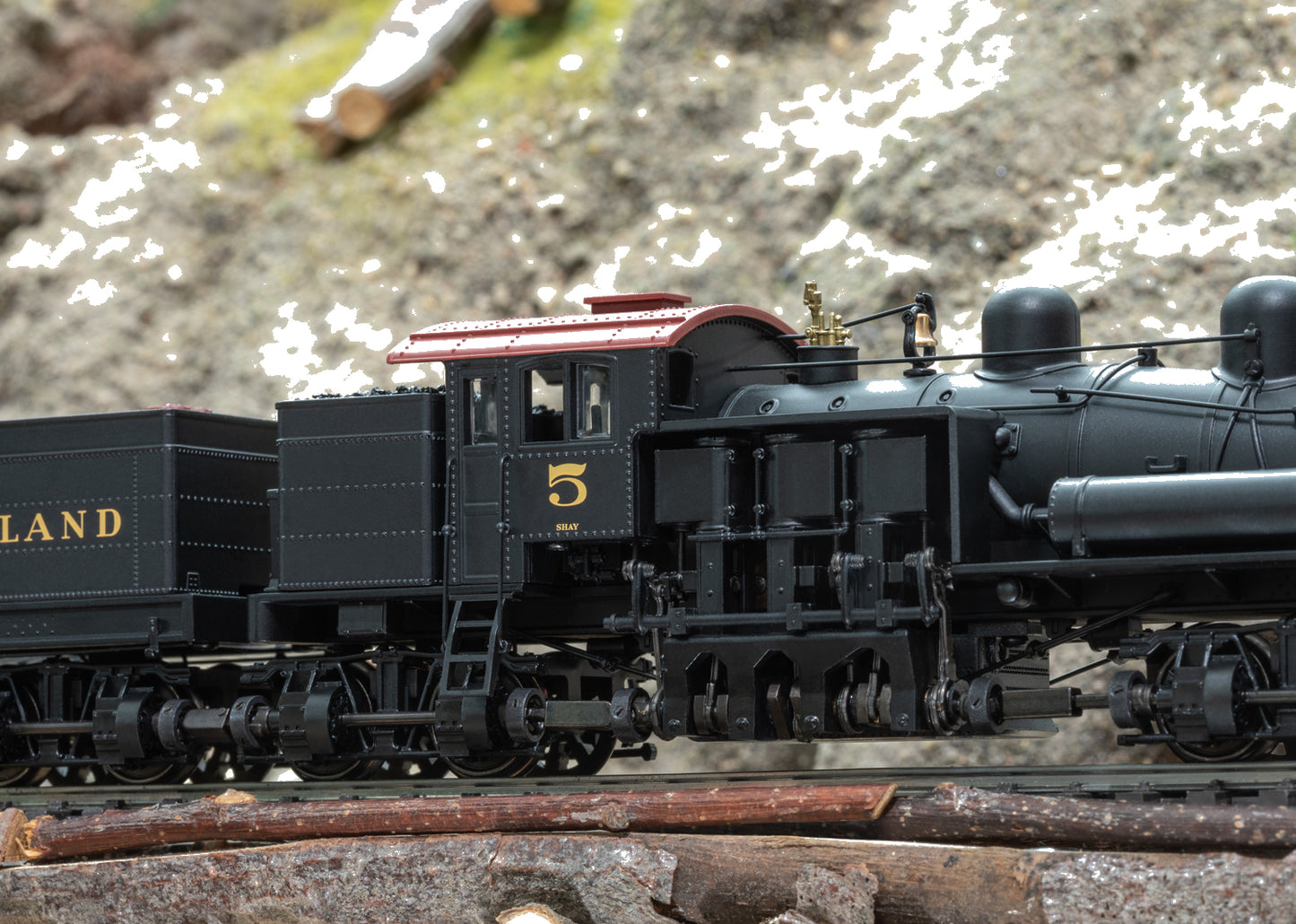 The Industrial Age also marked the beginning in the USA of systematic development of natural resources which provided the material for rapid progress. Coal became the most important source of energy and wood was needed in large quantities for the construction boom across the country. However, there were many extensive forest areas and also large coal deposits often in remote regions that were difficult to access. The sawmill owner Ephraim Shay developed a gear-driven steam locomotive around 1873 in order to open these areas up better. Its design allowed it to pull heavy loads on difficult, curving routes. At high speeds it could not manage the job. Starting in 1880 the large locomotive builder LIMA Locomotive Works took over its construction and continuously refined it. The basic principle remained the same: A vertically installed steam engine mounted on the right side drove all the axles using a gear drive and thereby provided optimal pulling power, whereby the boiler had to be mounted offset to balance the weight distribution. The maximum speed was limited to about 25 km/h / 15 mph due to the small gear reduction. The Shays turned out very well and became a mystique among steam locomotives not only due to their unusual technology but also because of their massive appearance. In the end, a respectable 2,770 Shay locomotives were built by 1945. Most ran on forest logging railroads, although a number of units were also delivered to important railroad companies. The Western Maryland Railway (WM), developing the numerous coal reserves in the eastern part of the USA, bought large Shays for branch lines to coal mines. There grades of up to 10% and curves of under 100 meters / 325 feet had to be mastered. By 1945 the WM used the massive, 136 ton four-truck Shay Number 5 in the Appalachians. It was replaced by the most powerful Shay ever built, Number 6, which still currently steams through the mountains of West Virginia in tourist service. The new Märklin Shay is entering the fascinating world of model railroading with this quite unusual chapter in locomotive history.