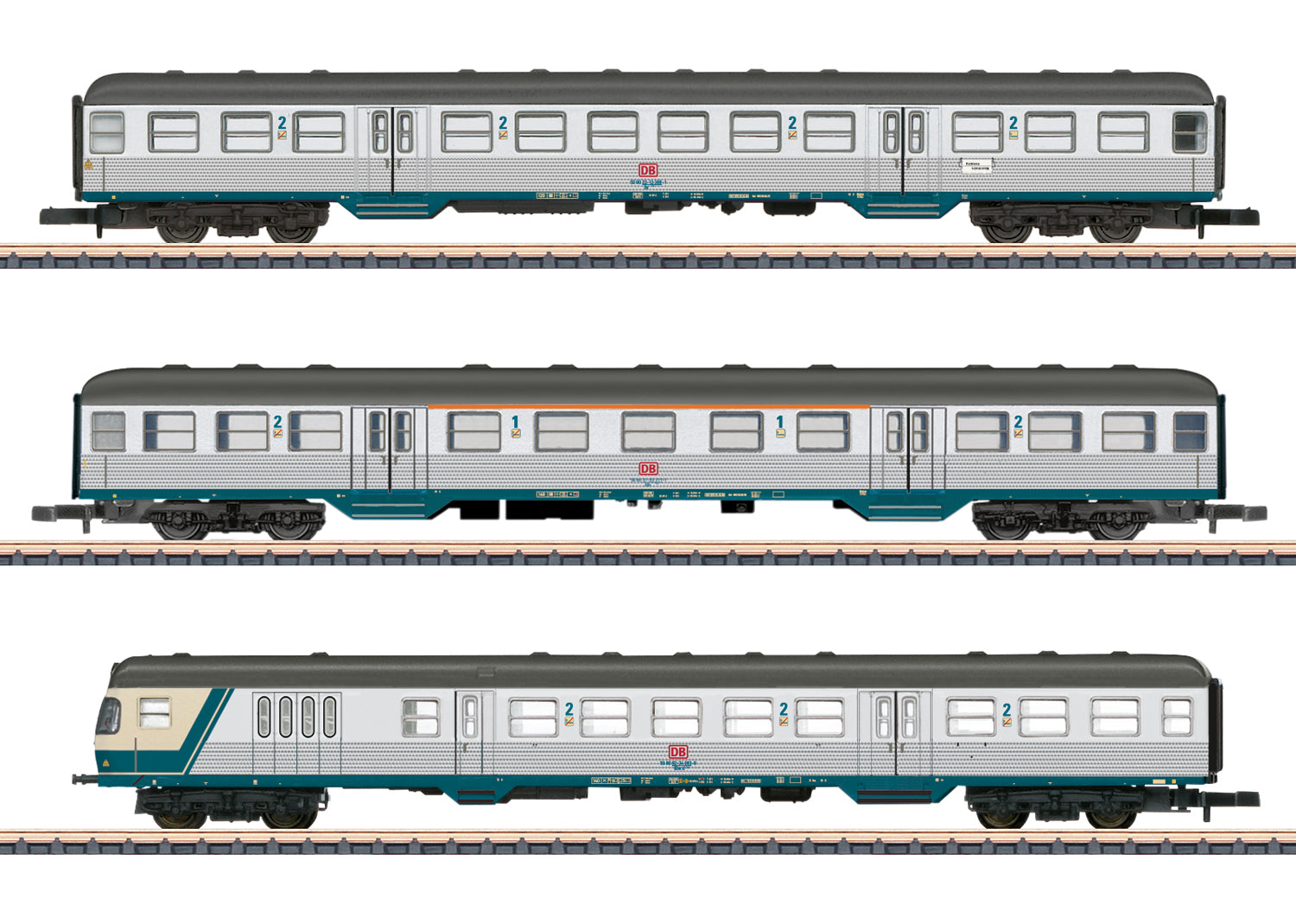 Model: This is the first time for a model of classic Silberlingen cars in Era V. The cab control car is new tooling with triple white LED headlights and dual red marker lights that change over with the direction of travel. The cars have close coupler hooks. Total length approximately 365 mm / 14-3/16".